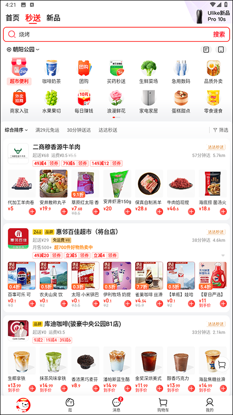 在京东的“秒送”频道里,外卖、咖啡奶茶、买药秒送、生鲜菜场、急用数码、水果果切等各类细分条目一目了然,能帮助用户迅速定位到自己需要的商品。