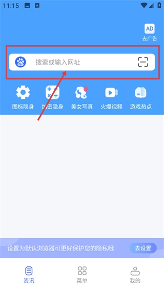 在浏览器的资讯页面,点击顶部标有【搜索或输入网址】的搜索框,就能激活输入状态,为查找内容做好准备。