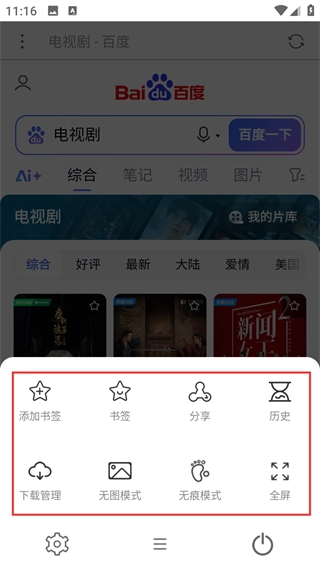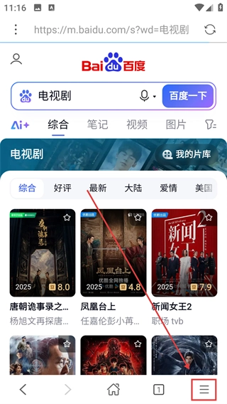 输入【电视剧】并进行搜索,进入结果页面后,点击底部的菜单按钮,就能展开更多功能选项了。