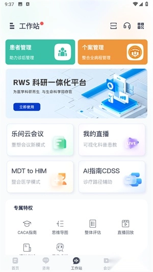 2、通过"工作站"入口可直接进入云端协作平台,支持在线开展各类医学会议和学术研讨。