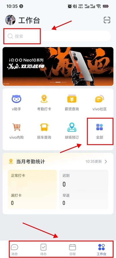 界面会展示所有聊天窗口,用户可以借助顶部的搜索栏,输入姓名或工号进行搜索,从而打开对应的对话;工作台整合了多种应用,包括V助手、考勤打卡、饭卡查询与充值、薪资查询、vivo社区、vivo内购、班车查询以及车辆权限申请等功能。