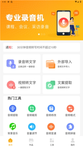 1、【首页页面】:此页面集合了软件内的热门功能,像录音转文字、外部导入、视频转文字、文案提取以及热门工具等都包含其中。