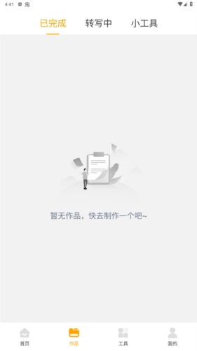 2、【作品页面】:该页面中是用户的作品,分为已完成、转写中、小工具;