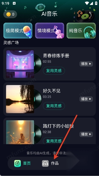 6、你也能在首页的灵感广场里找到心仪的歌曲,点击“复用灵感”即可。
