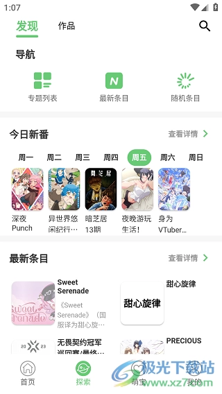 2、探索内容、发现佳作和浏览作品都能实现,一键即可观看新番,最新条目也会全部展示。