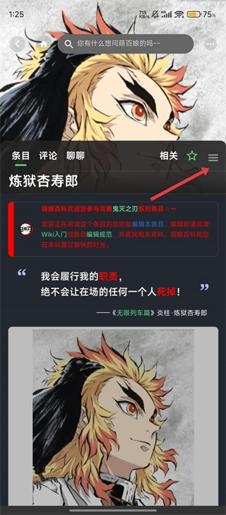 2、在搜索页面,你可以选择【萌百热点】中的热门条目,像【炼狱杏寿郎】这类,就能快速进入对应的相关内容页面啦。