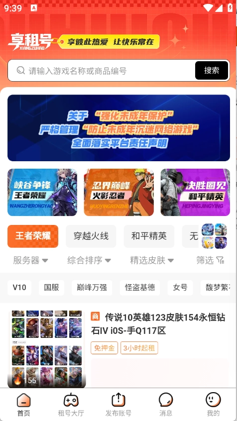 享租号是专为玩家打造的游戏交易平台,涵盖王者荣耀、蛋仔派对、和平精英等热门游戏类型。平台上的所有账号均为正版,且需通过严格检测方可发布。专业客服团队随时为用户解答疑问,助力玩家轻松选购到心仪的游戏账号。