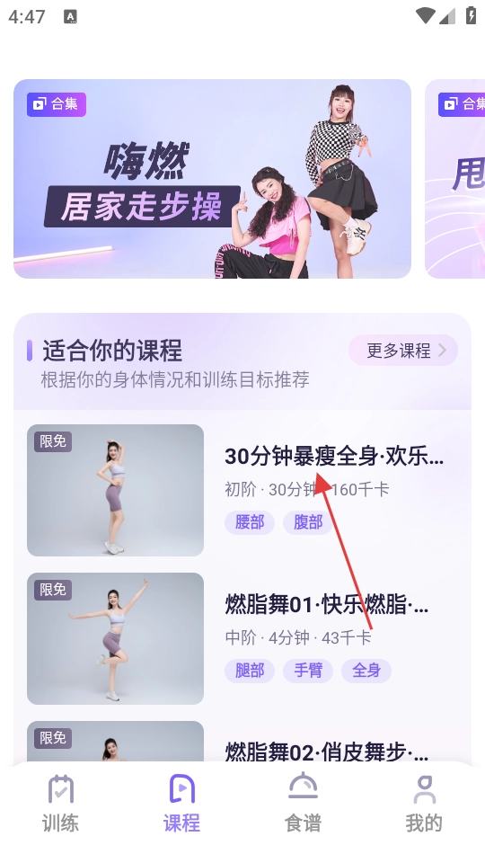 3、在课程页面找到【30分钟暴瘦全身·欢乐有氧·体能提升】这一课程并点击,即可进入该课程的详情页面。