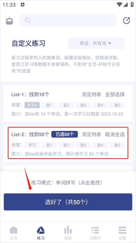 也就是说,在“复习”页面随意选择一种复习模式后,会弹出list列表,这时可以从列表里挑选收藏的单词来展开复习;不过目前自主收藏的单词还没办法进行复习。