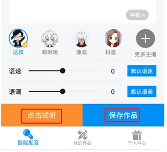 智能配音功能支持文字快速转化为语音,提供多种音色供选择,并且可以对音量、语调以及语速进行调节。