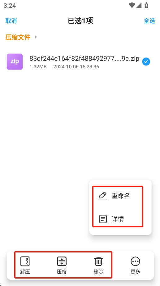 4、压缩文件的管理:完成压缩后,能够直接在王中对文件进行管理,可执行解压、删除、重命名等相关操作。