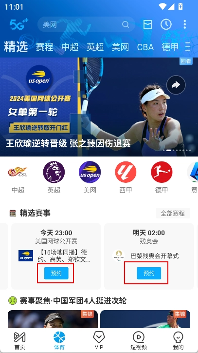 2、体育赛事预约流程:进入“体育”板块,点击“赛程”,选择“全部”赛事列表,找到目标赛事后点击“预约”。温馨提示:节目上线时,客户端会推送信息通知您,届时您可直接返回客户端观看。