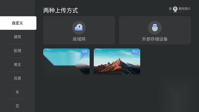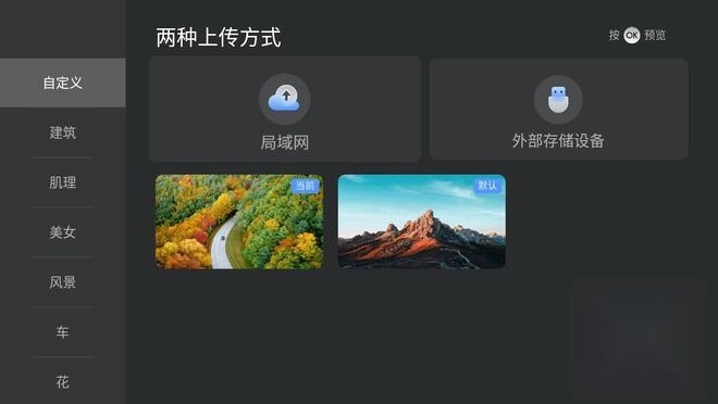 3、打开后找到自定义选项,借助局域网或U盘,即可更换成自己喜爱的壁纸。