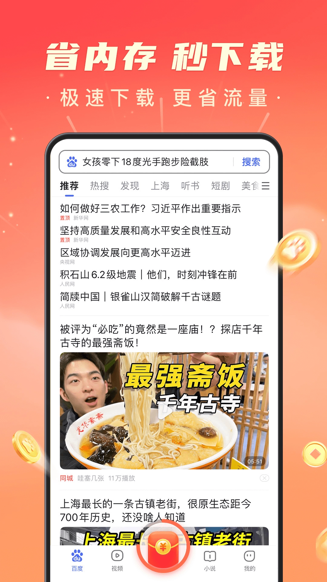 百度极速版是一款简洁流畅的手机浏览器工具软件,能为用户带来舒适的浏览体验,使用起来轻快便捷,搜索结果可一键直达,同时它占用的手机内存空间更小,即便是小容量手机也能流畅运行!
