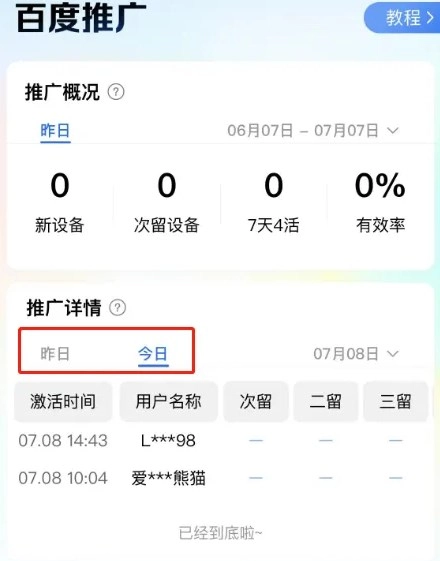 在「百度推广」页面可查看当日推广社保的详细情况,还能查看该用户从次日到第8日的留存情况。推广详情默认优先展示昨日的数据,若想查看今日数据,需要点击「今日」按钮。