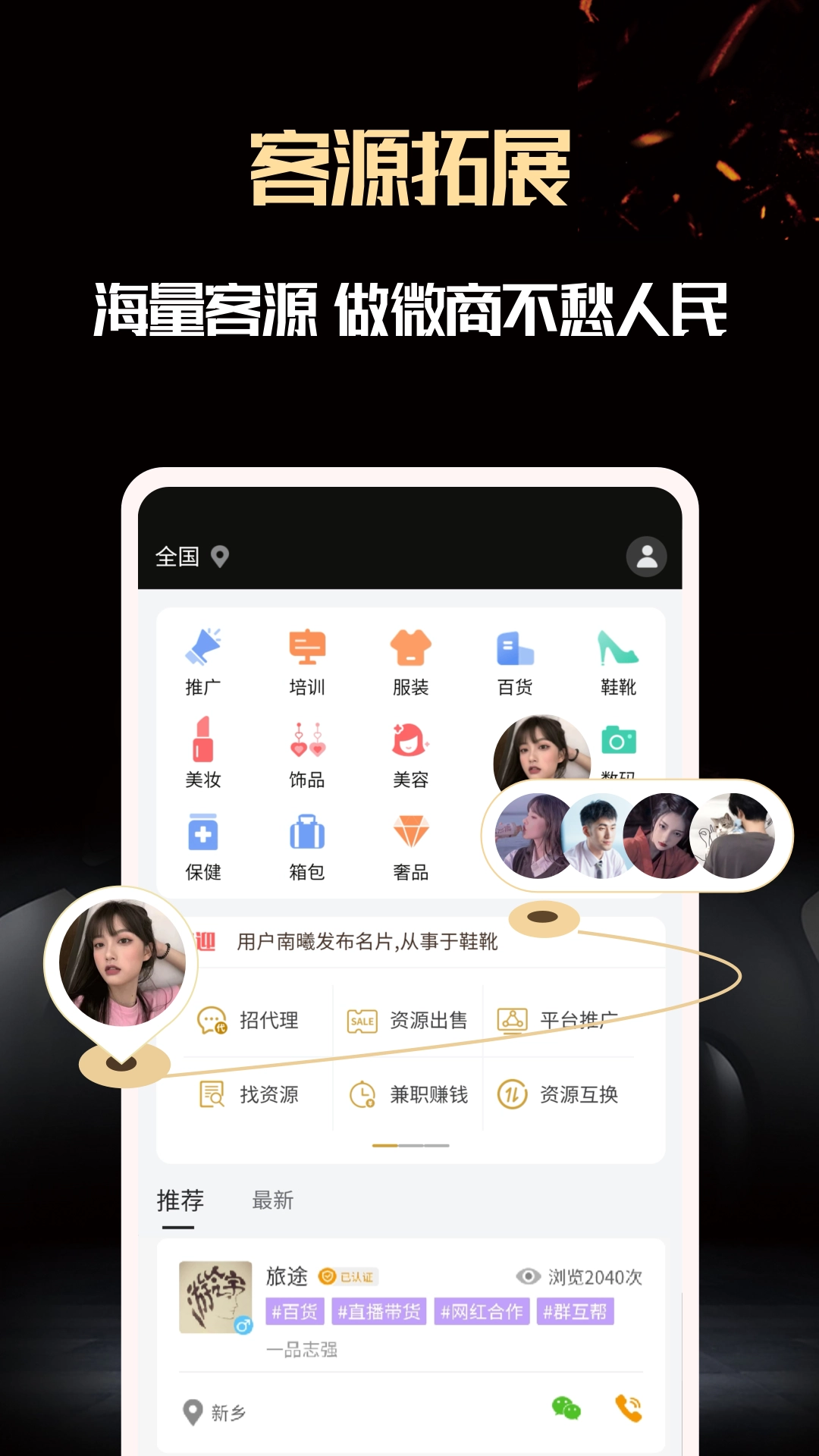 2、人脉资源拓展:支持通过手机号添加好友、拍照识别添加好友等多种添加方式,助力用户轻松拓展微商人脉圈。