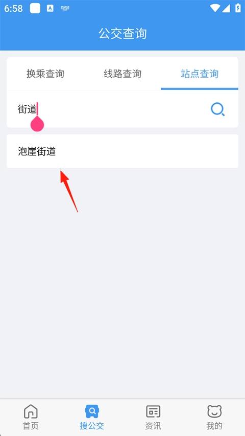 1、打开熊猫出行应用,进入搜公交页面后,在搜索栏输入您计划搭乘的站点名称进行搜索,随后点击进入该站点页面。