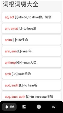 英语词根词缀字典是一款自由学习英语的,在这款字典中收录了很多的英语单词,通过各种词根,来帮助更加便捷查询各种英语单词,每一次单词后都有十分详细的词缀解析,来帮助用户快速记忆各种单词。