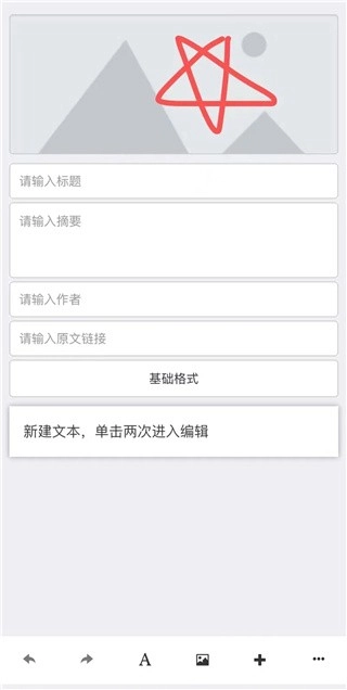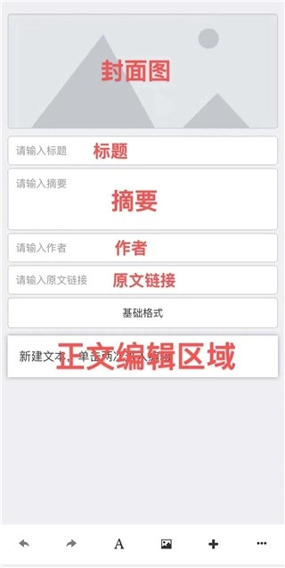 点击“新建图文”后,系统会直接跳转至图文编辑页面。在此页面中,从上到下依次可进行如下设置:封面图、标题、摘要、作者、原文链接、基础格式,以及正文编辑区域。