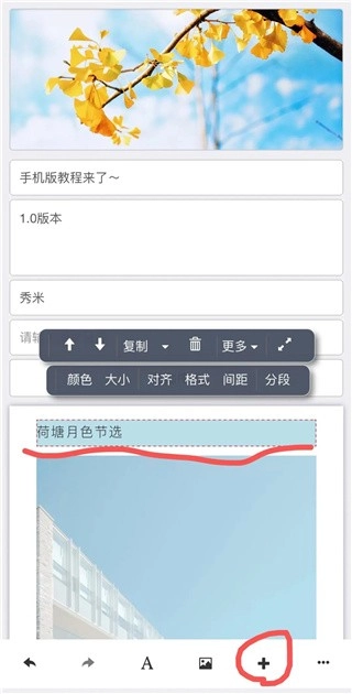 另外,在正文编辑区域未选中任何组件的情况下,点击编辑页面底部的“A”图标,就能在正文编辑区域的末尾添加一个空白的文字组件。