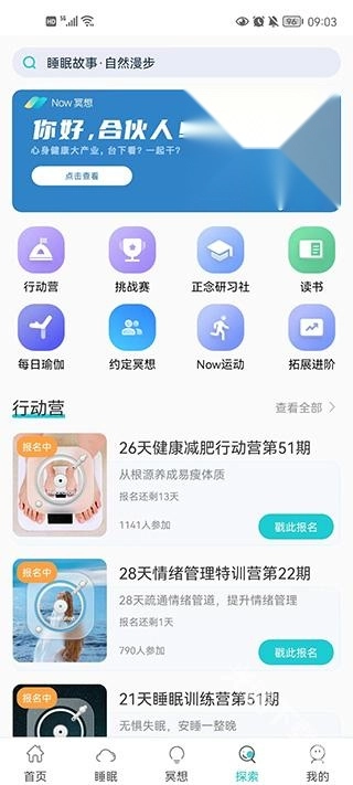 在这个模块里,最具吸引力的部分当属软件内的训练营了,它不仅配备了专业的健康减重周期规划,还包含了解压相关的课程内容。
