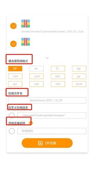 3、再选择压缩包格式类型以及压缩文件名,可以添加压缩密码也可以不添加,之后点击zip压缩即可。