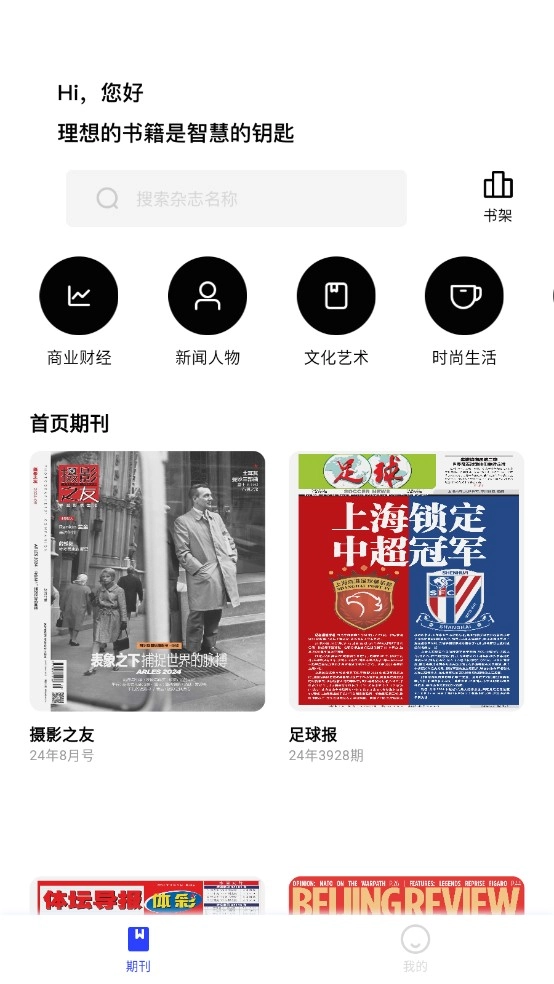 首页设有详细的期刊分类板块,涵盖商业财经、新闻人物、文化艺术等多种类型。