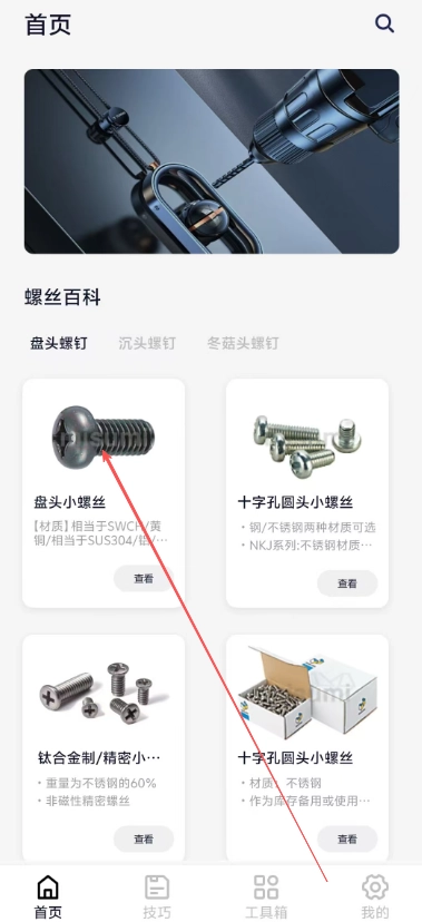 用户进入软件后,可直接在首页查看各类螺丝的百科知识。