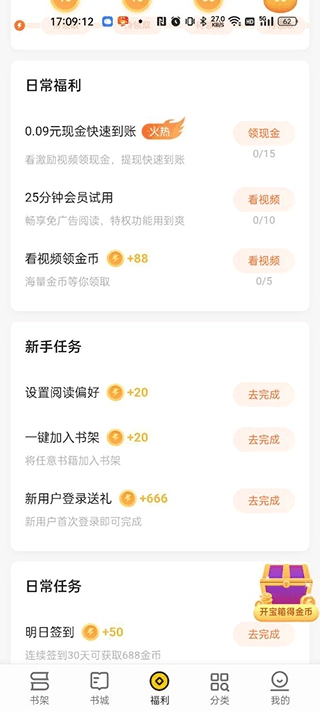 2、只需点击页面中间下方的福利按钮,就能完成每日签到并领取金币,所获金币还能兑换为零钱进行提现。