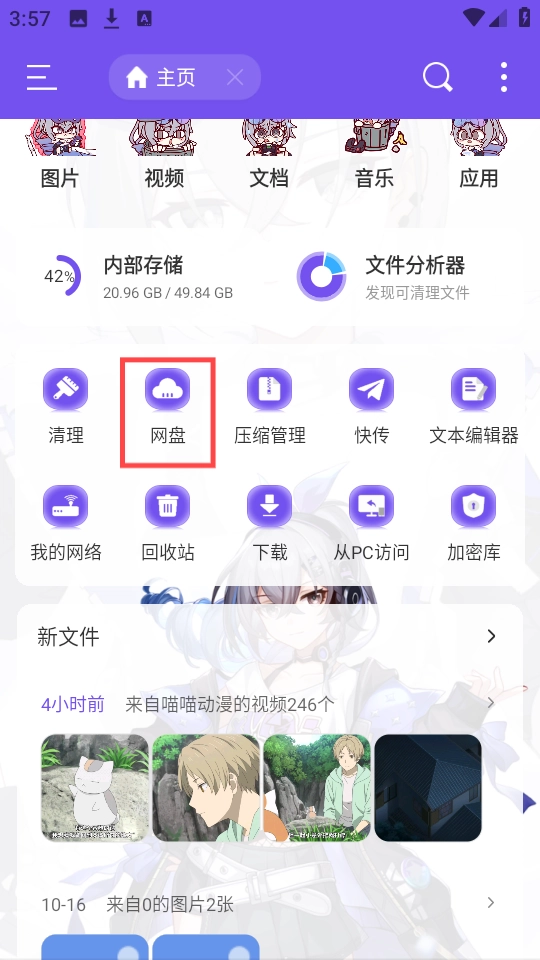 1、打开应用首页,找到并点击“网盘”入口。