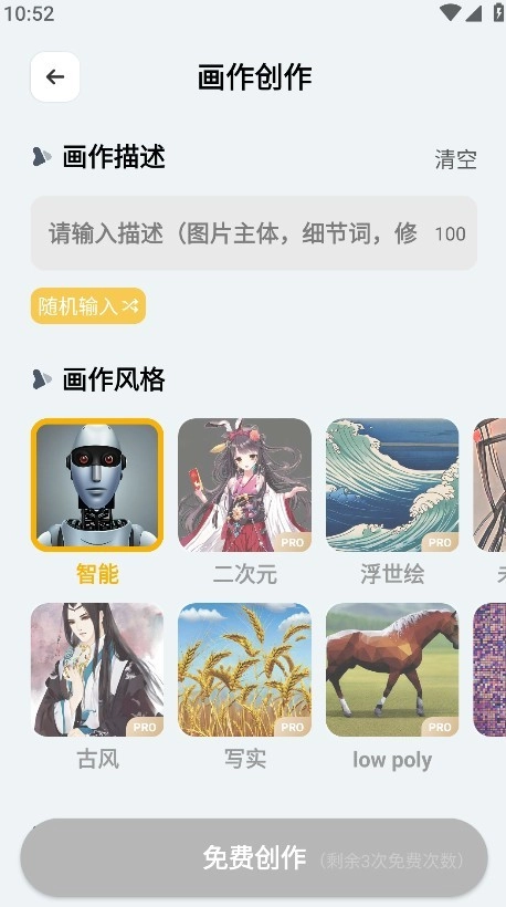 5.请输入画作的描绘内容,可自定义选择画作风格、画作数量、画作比例等参数。