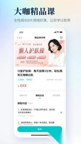 4.大咖精品课:汇聚超1000门优质课程,涵盖自我提升、情感经营、形象塑造、职场发展等多元领域,导师阵容专业,教学体系完善,助力所学落地实践。