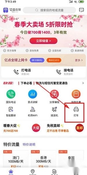 1、打开"亿点联"无线网卡应用,进入出租车服务界面。