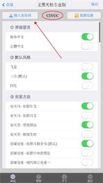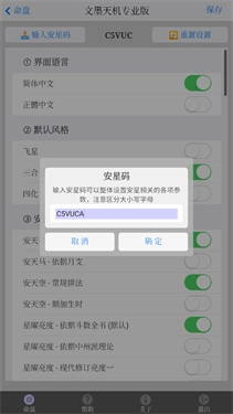 2、点击“输入安星码”,中间红圈标注的内容即为安星码,您也可以输入其他已设置完成的安星码,输入后就能得到与之完全一致的排盘结果了。