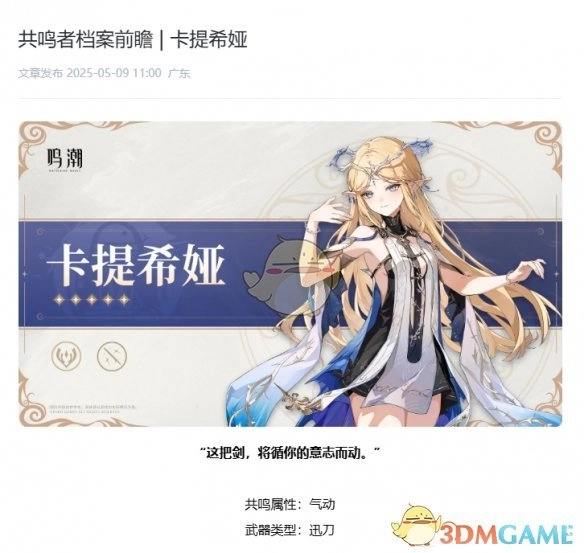1. 鸣潮官方对外披露了角色详细信息,其属性为气动,所使用的武器是迅刀。