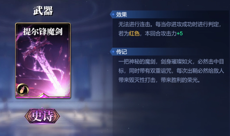 我们选用了提尔锋魔剑作为武器,以此强化夸父一刀流的能力。搭配力量祝福带来的 +3 攻击力、【舍身重击】提供的 +4 攻击力,以及【逐日奔腾】所附加的伤害 +2 效果。一旦提尔锋魔剑的判定成功,便能对对手造成高达 16 点的恐怖伤害。