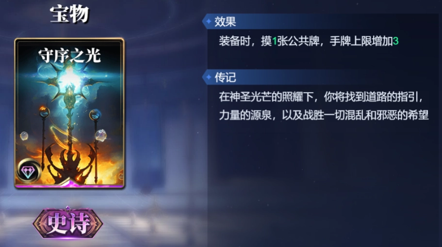 携带守序之光,是为了增加祝融的手牌上限,本身祝融身为力量神灵缺少过牌能力,守序之光可以提升手牌上限,帮助祝融进行屯牌。