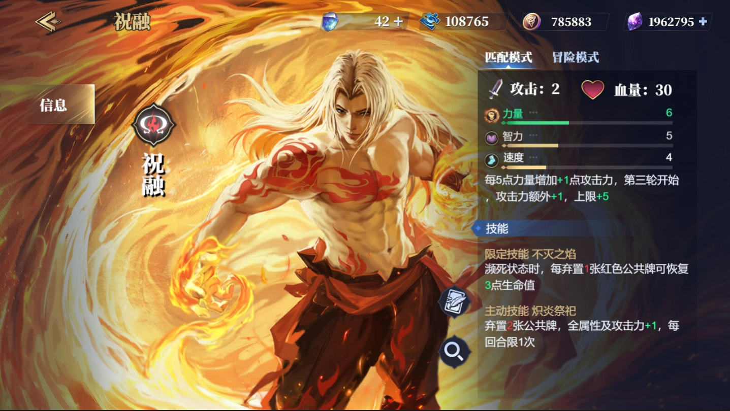 祝融,初始攻击力2点,30血量,力智速初始三维为6/5/4