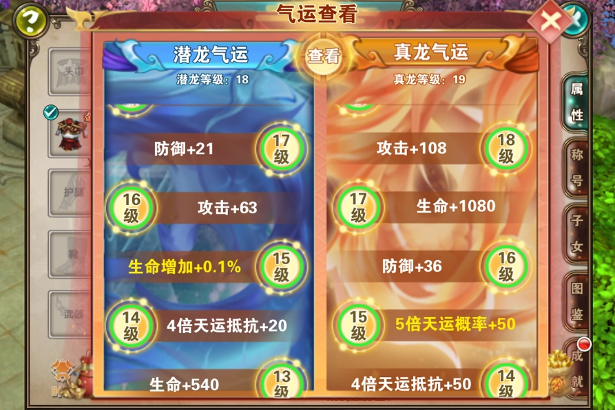 两种气运累积到一定数量,玩家可以进行气运等于的升级,并获得相应的属性提升战力!