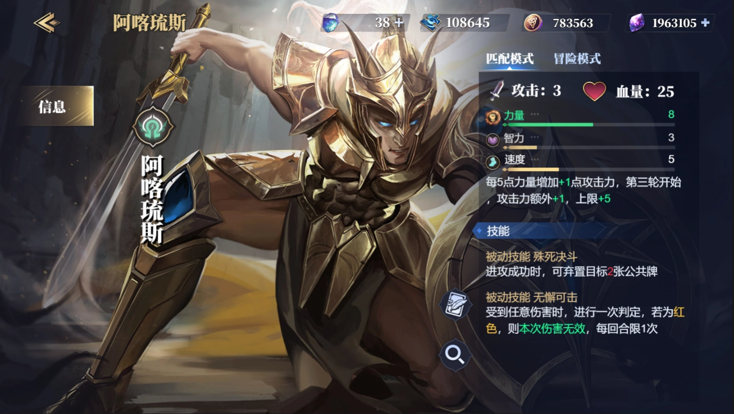 阿喀琉斯,初始攻击力3点,25血量,力智速初始三维为8/3/5