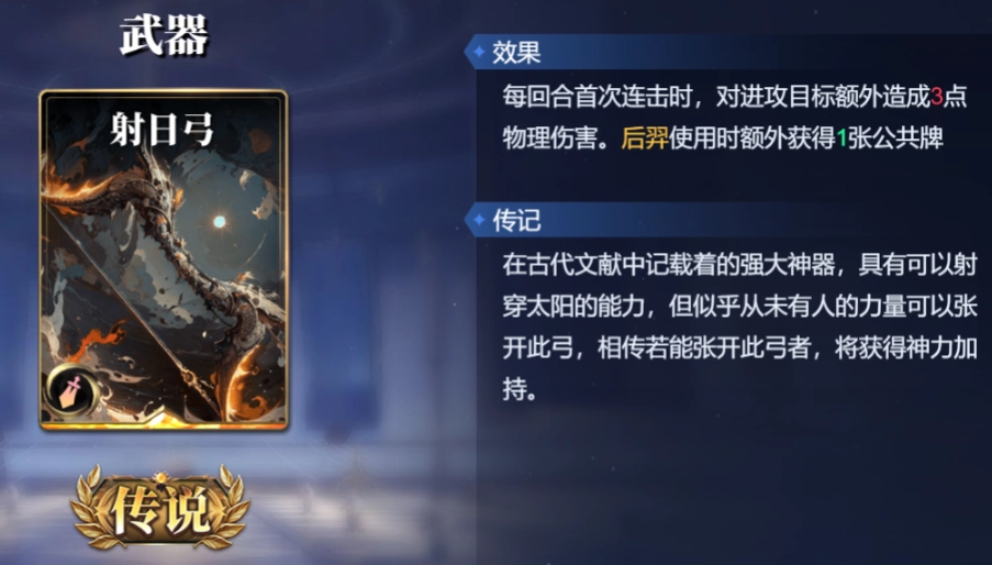 先来说武器的选择,可挑选射日弓与提尔锋魔剑。射日弓的伤害效果极易触发,属于极为万能的武器牌,几乎任何神灵都能携带。