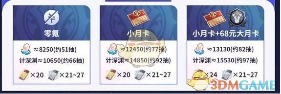 3、小月卡搭配68元大月卡:可得15530星琼、24张星轨专票以及21 - 27张星轨普票。