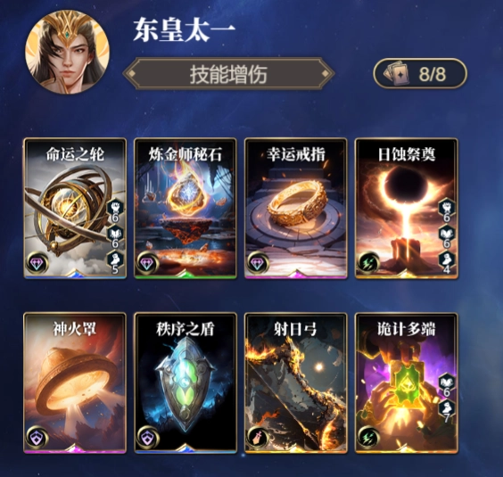 东皇太一,这位东方天地间至高无上的神明,主宰着光明与秩序,掌控万物命运,维系天地平衡。在《诸神竞技场》这款游戏里,【神威降临】堪称东皇太一的核心技能,该技能可通过更换自身装备,亦或是偷取、摧毁对手装备来实现输出。而技能【天罡战术】更是赋予了东皇太一将防守转化为摧毁的强大能力。只是在使用这些技能前,务必充分考量自身的生存状况,不然一旦将防守牌耗尽,便极易遭受对手的猛烈进攻。