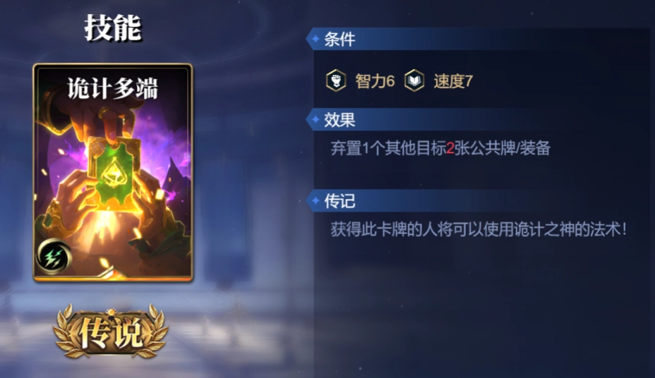 被动技能【神威降临】:场上每有1张装备牌离开装备区时,可对1个其他目标造成2点法术伤害