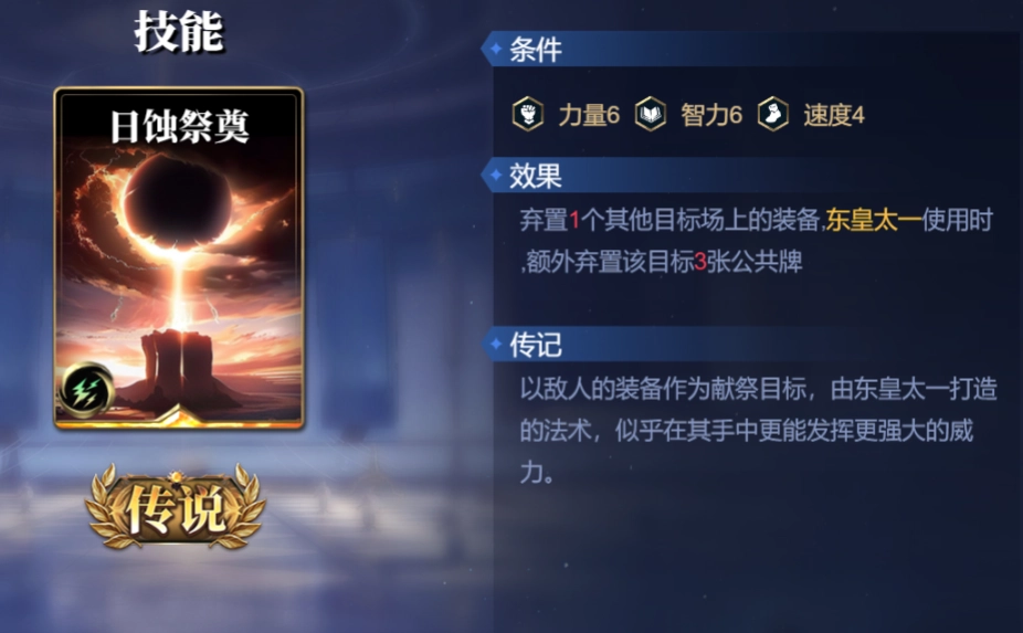 日蚀祭奠:弃置1个其他目标场上的装备,东皇太一使用时,额外弃置该目标3张公共牌。