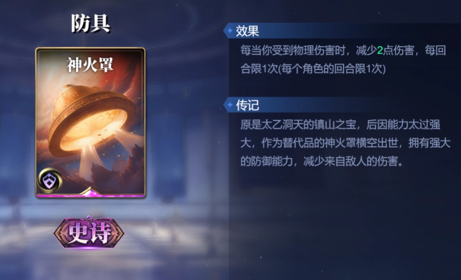 神火罩,受到物理伤害时,减少2点伤害,每回合限1次。每回合可以-2点物理伤害,是非常好用的防具。