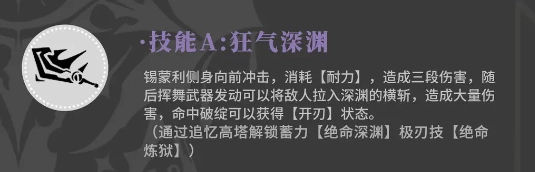 锡蒙利身形一侧,猛地向前冲去,此举动会消耗【耐力】,并造成三段伤害。紧接着,它挥舞手中武器,施展出一招能将敌人拽入深渊的横斩,这一横斩可造成巨额伤害,要是击中敌人的破绽,还能获得【开刃】状态。