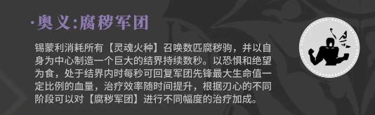 锡蒙利倾其所有【灵魂火种】,唤出数匹腐秽驹,同时以自身为核心,构建一个巨大结界,此结界将存续数秒。该结界以恐惧与绝望为养分,身处其中时,每秒可按军团先锋最大生命值的一定比例回复血量,且治疗效率会随时间逐步提高。另外,依据刃心所处的不同阶段,能对【腐秽军团】施加不同程度的治疗加成。