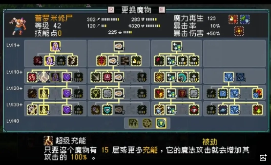 有一只魔物,用起来意外地好用。作为辅助角色,它能强行转移伤害进行保护,专注防御与专注生命的属性让它坦度很高,还具备全面进攻的加buff能力,光转更是额外提升了buff上限。它自身挨打和行动时都能施加电击效果,关键还拥有充能再生技能,这相当于它有两条命。普罗米修尸即便采用偏辅助的配置,在关键时刻也能打出相当可观的伤害。它另一个核心被动是超级充能,当充能达到15层及以上时,能使魔法攻击提升至攻击的100% ,配合自身高倍率的雷霆一击技能,就算是辅助向侧重叠生命防御的普罗米修尸,在充能叠起来后也能打出不错的伤害。更不用说走暗转输出路线的普罗米修尸了,要是再配合拥有充能放大器的队友,完全可以成为电击队的主C。