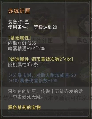 倘若各位大侠仔细【留意】,便会发觉其身上携带着一件宝物——赤练针匣。